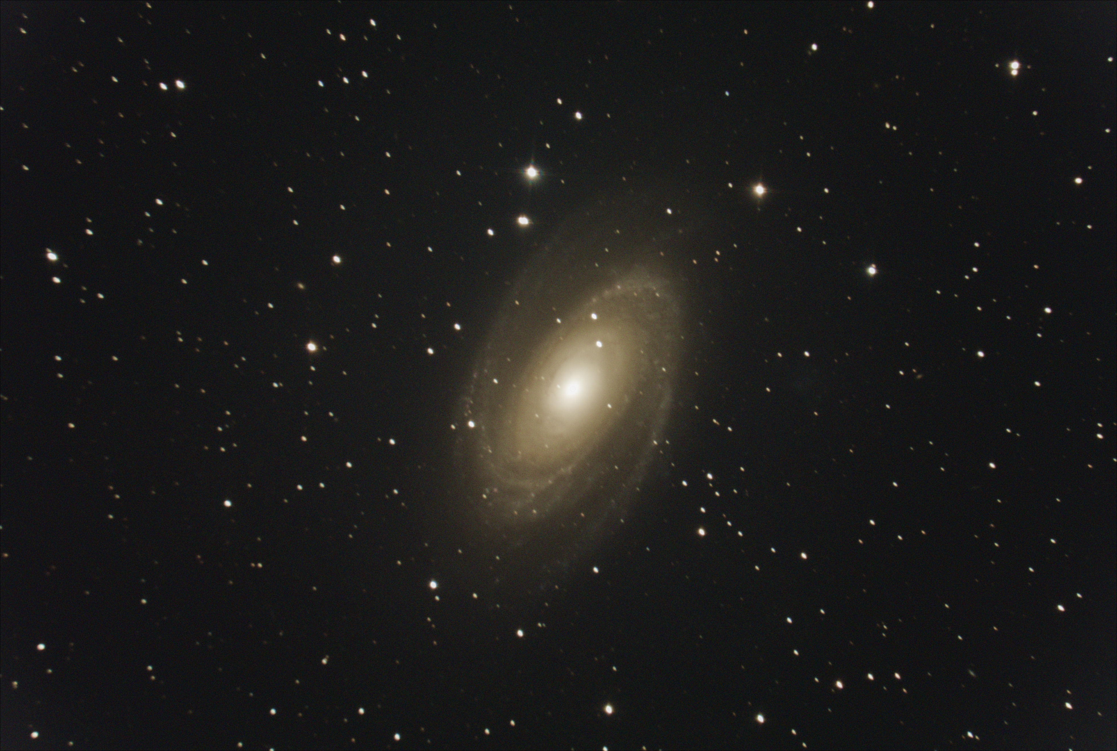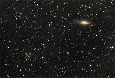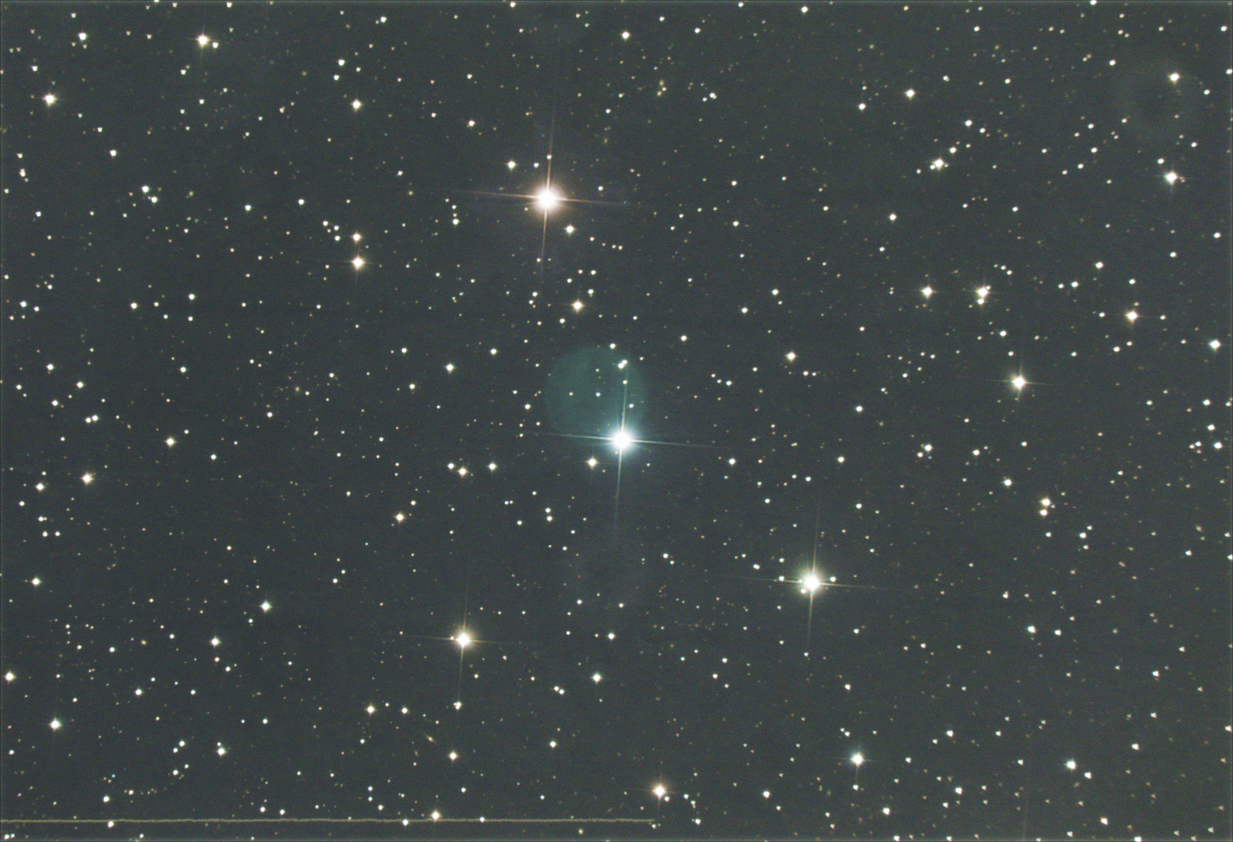 404というHTTP的に忌々しい数字とおんなじ数字を持つこの銀河、別名はMirach' Ghost。アンドロメダ座の星ミラクの背後霊のように見えることからこう呼ばれているとの由。 というわけで真ん中のめっちゃ明るい星はミラクで、その右上に見える光のシミがNGC404です。