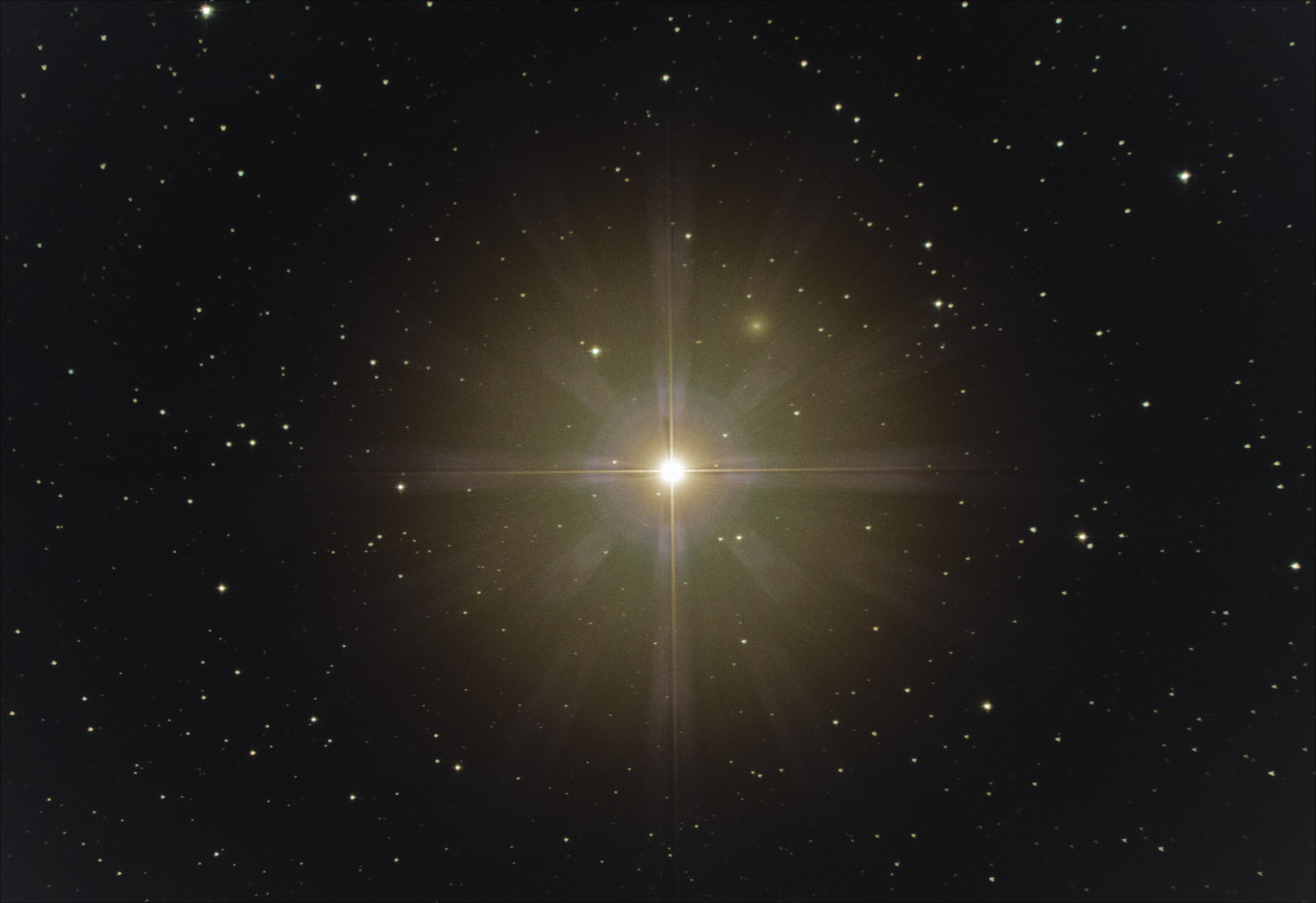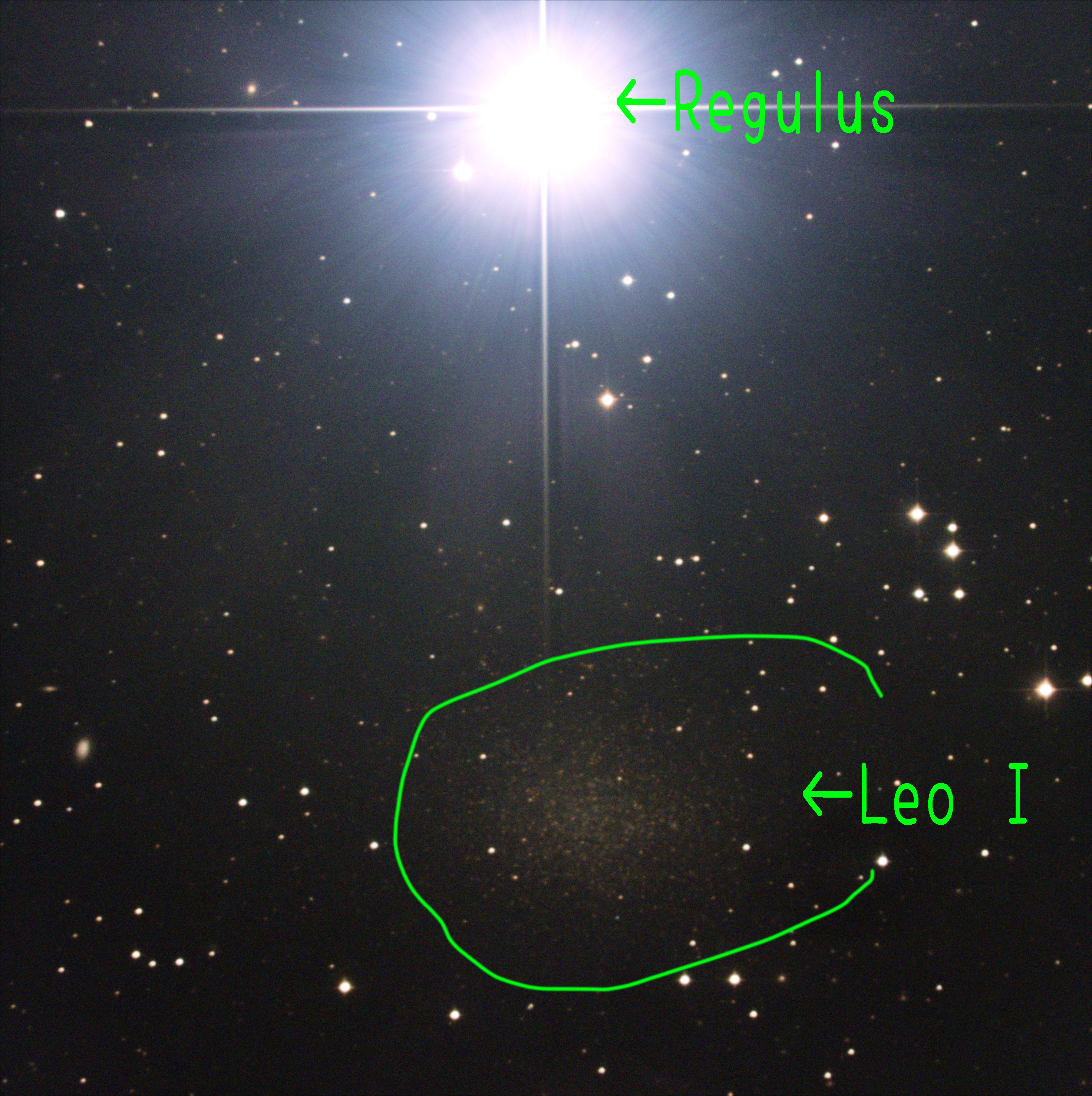 しし座の一等星レグルスの見かけ上のご近所。相当淡い銀河だけど、写そうと思えば写るんですねぇ。淡すぎてどれかわからない人向けの注釈付き画像はこっち。