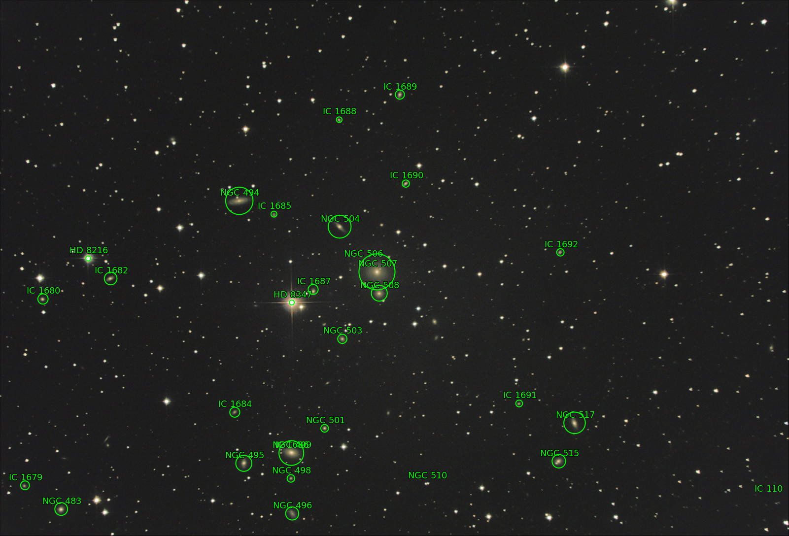 銀河団です。そのうち1つの銀河の名前がNGC508。でも銀河団なので沢山映ってます。NGC508はどれ?というわけで注釈つき画像はこっち(Annotated image is here)。